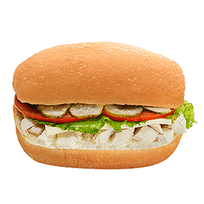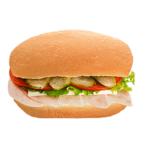 Булочка, белый соус, салатный лист, ветчина куриная, томаты, огурчики, сыр