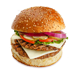 Булочка с кунжутом, соус гриль, фиолетовый лук, салатный лист, 2 говяжьих котлеты, томаты, огурчики, сыр