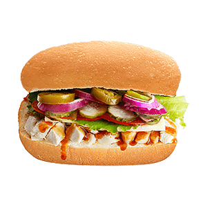 ОстроБулочка, соус терияки, салатный лист, фиолетовый лук, куриное филе, перчики халапеньо, томаты, огурчики, сыр