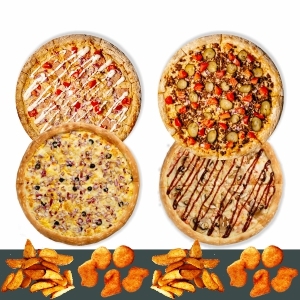 4 Пиццы 32 см - Сырный цыпленок, Пицца Чизбургер, Ранч, Цыпленок BBQ + 2 порции наггетсов по 5 шт, + 2 средние порции картофеля дольками15100