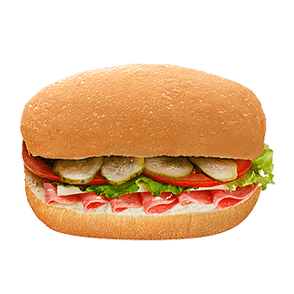 Булочка, белый соус, салатный лист, салями говяжья, томаты, огурчики, сыр