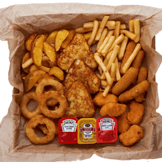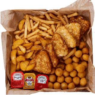 Картофель Фри, картофель дольками, куриные наггетсы, луковые кольца и 3 разных порционных соуса5200