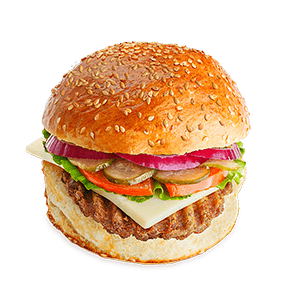 Булочка с кунжутом, белый соус, фиолетовый лук, салатный лист, говяжья котлета, томаты, огурчики, сыр