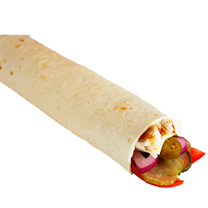 ОстроПшеничная тортилья, соус терияки, белый соус, фиолетовый лук, куриное филе, перчики халапеньо, томаты, огурчики, сыр