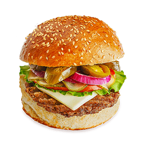 ОстроБулочка с кунжутом, белый соус, фиолетовый лук, салатный лист, говяжья котлета, томаты, огурчики, перчик халапеньо, сыр
