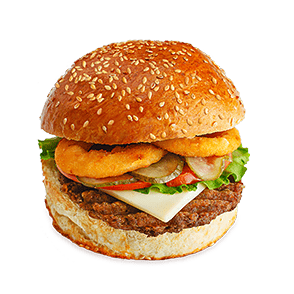 Авторский рецептБулочка с кунжутом, белый соус, салатный лист, говяжья котлета, томаты, огурчики, сыр, луковые кольца во фритюре