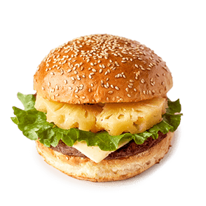 Булочка с кунжутом, белый соус, салатный лист, говяжья котлета, ананас, сыр