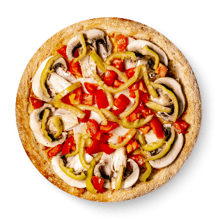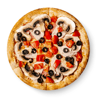 ВегетарианскаяТоматный соус, моцарелла, кукуруза, сладкий перец, шампиньоны, оливки, грибной соус