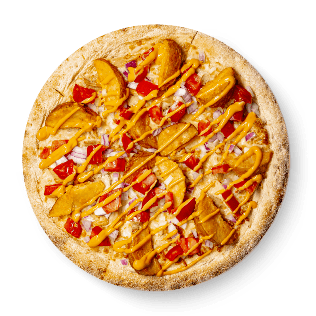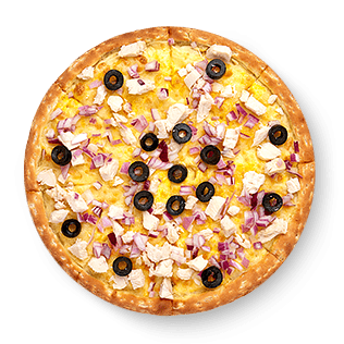 Сырный соус, моцарелла, куриное филе, фиолетовый лук, оливки