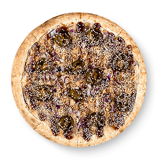 НовинкаСоус Терияки, моцарелла, куриное филе, острые перчики халапеньо, фиолетовый лук, кунжут