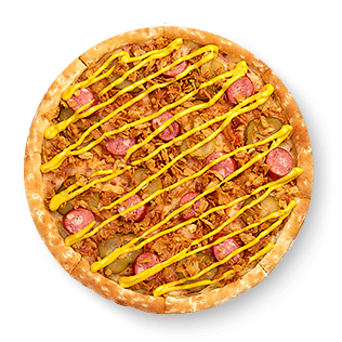 Авторский рецептТоматный соус, моцарелла, говяжьи сосиски, маринованные огурчики, горчичный соус, хрустящий поджаренный лук
