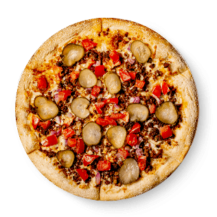 Сырный соус, моцарелла, говяжий фарш, томаты, маринованные огурчики, фиолетовый лук