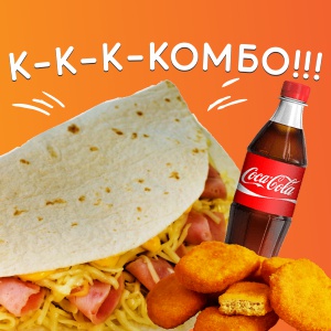 2 cалат-ролла Цезарь, 2 порции куриных наггетсов по 5 шт, 2 сырных cоуса, 2 Сoca Сola 0,5 л6850