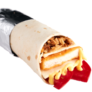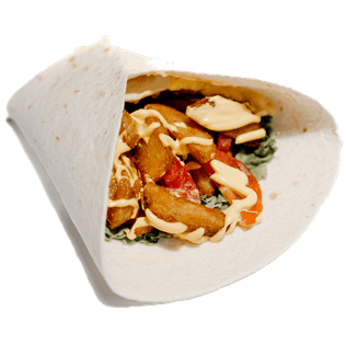 НовинкаПшеничная тортилья, сырный соус, куриные стрипсы, дольки картофеля, томаты