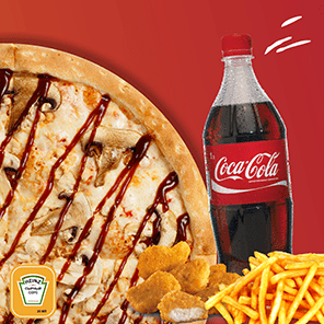 НовинкаКомбо Хэпии: Пицца Цыпленок BBQ 32 см, куриные нагетсы 8 шт, картофель фри бол., соус порционный Cырный, Coca Cola 1 л7100