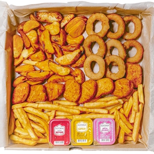 Картофель Фри, картофель дольками, куриные наггетсы, луковые кольца и 3 разных порционных соуса5550