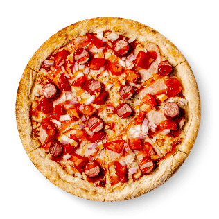 НовинкаТоматный соус, моцарелла, ветчина куриная, говяжьи сосиски, томаты, фиолетовый лук, соус сладкий Чили