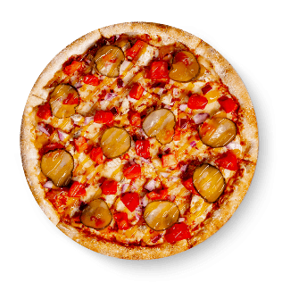 Авторский рецептТоматный соус, моцарелла, куриное филе, томаты, маринованные огурчики, фиолетовый лук, соус сладкий Манго