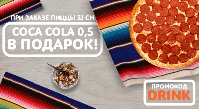 Пицца Грибная сказка 32 см, пицца Салями 32 см, пицца Чесночный цыпленок 32 см, Coca Cola 1л 3 шт.